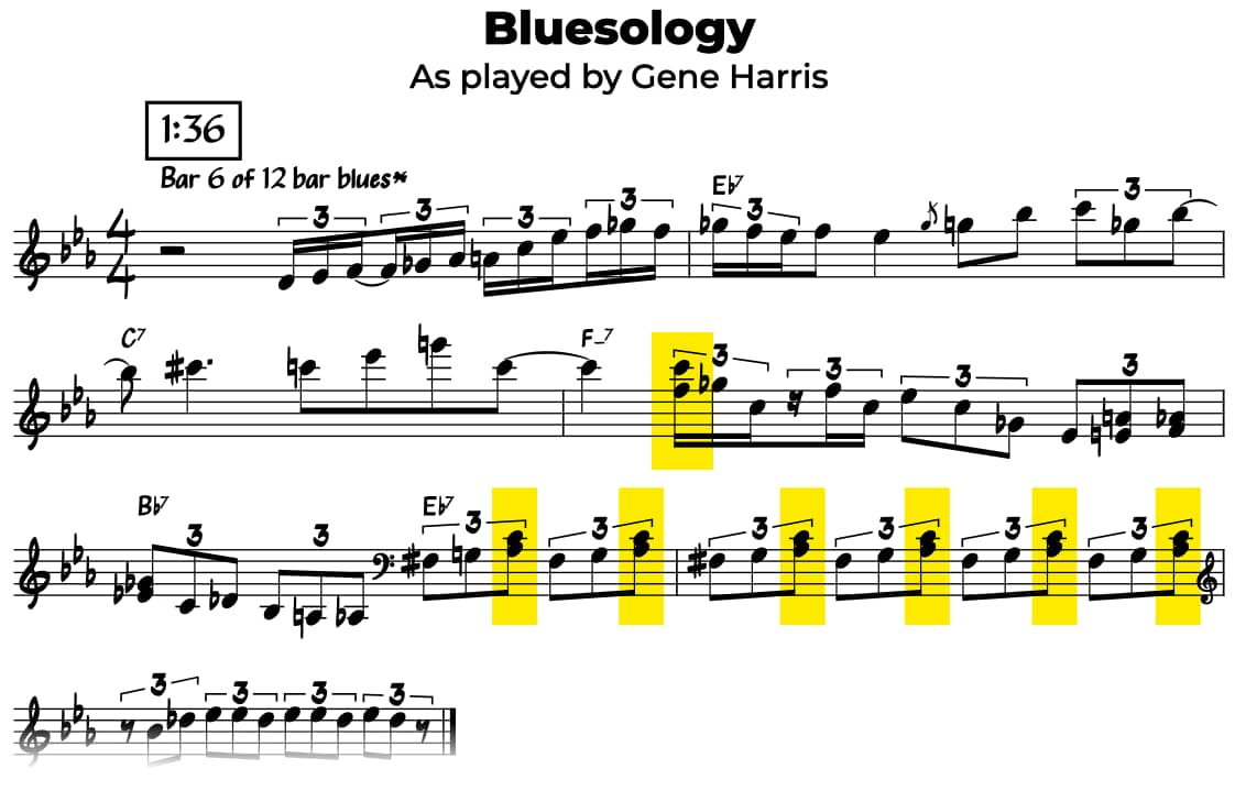 Reader, On C Jam Blues, the Oscar Peterson Trio plays something I want you to hear. They extend the 12-bar blues form to 16 bars by adding 4 bars of stop time at the end. The band hits once, then drops out completely, leaving Oscar to fill the silence with a 4-bar blues phrase that drives back to the top of the form. Oscar does this for the first time at 3:05, after the head. Stop time is when the rhythm section plays unison hits and drops out, leaving the soloist to play over silence. It's a...